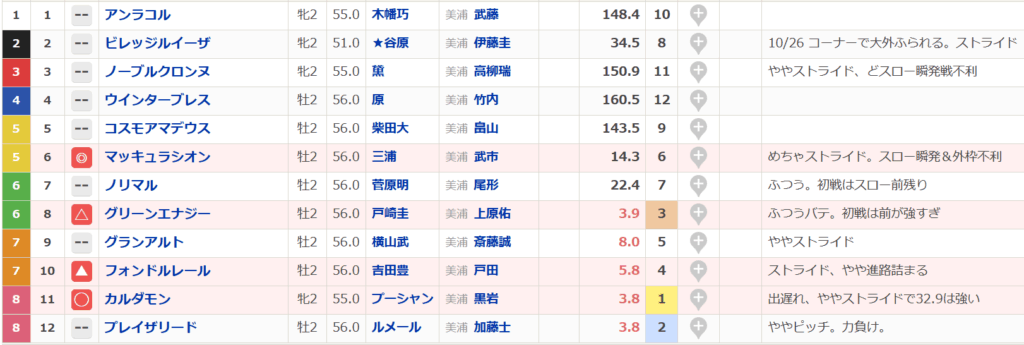 相手にはブライトエアリー。スタートの速さではこの馬とチェンドル、シトリンテソーロあたりのほうが早そう。コース適性も悪くないはずで堅実に上位にいるイメージ。